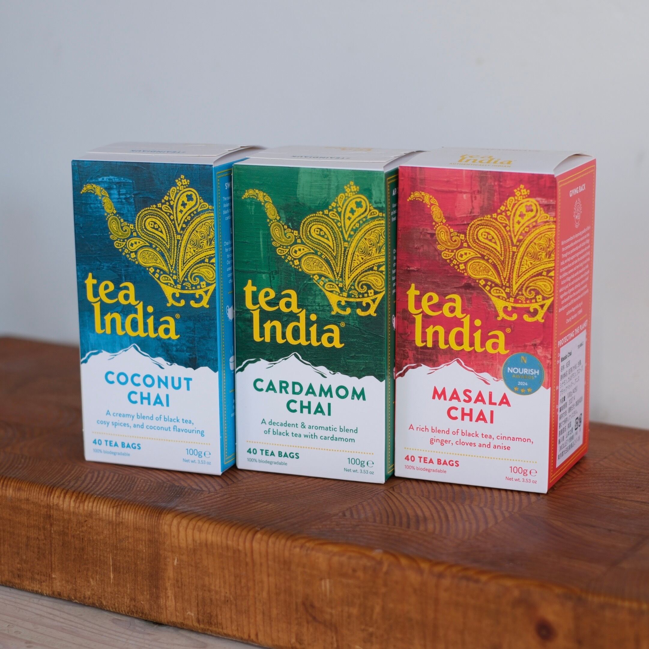 ラインナップは、「マサラチャイ」「カルダモンチャイ」「ココナッツチャイ」「ジンジャーチャイ」の4種。それぞれ風味豊かで個性的、さまざまな飲み方で楽しめます。