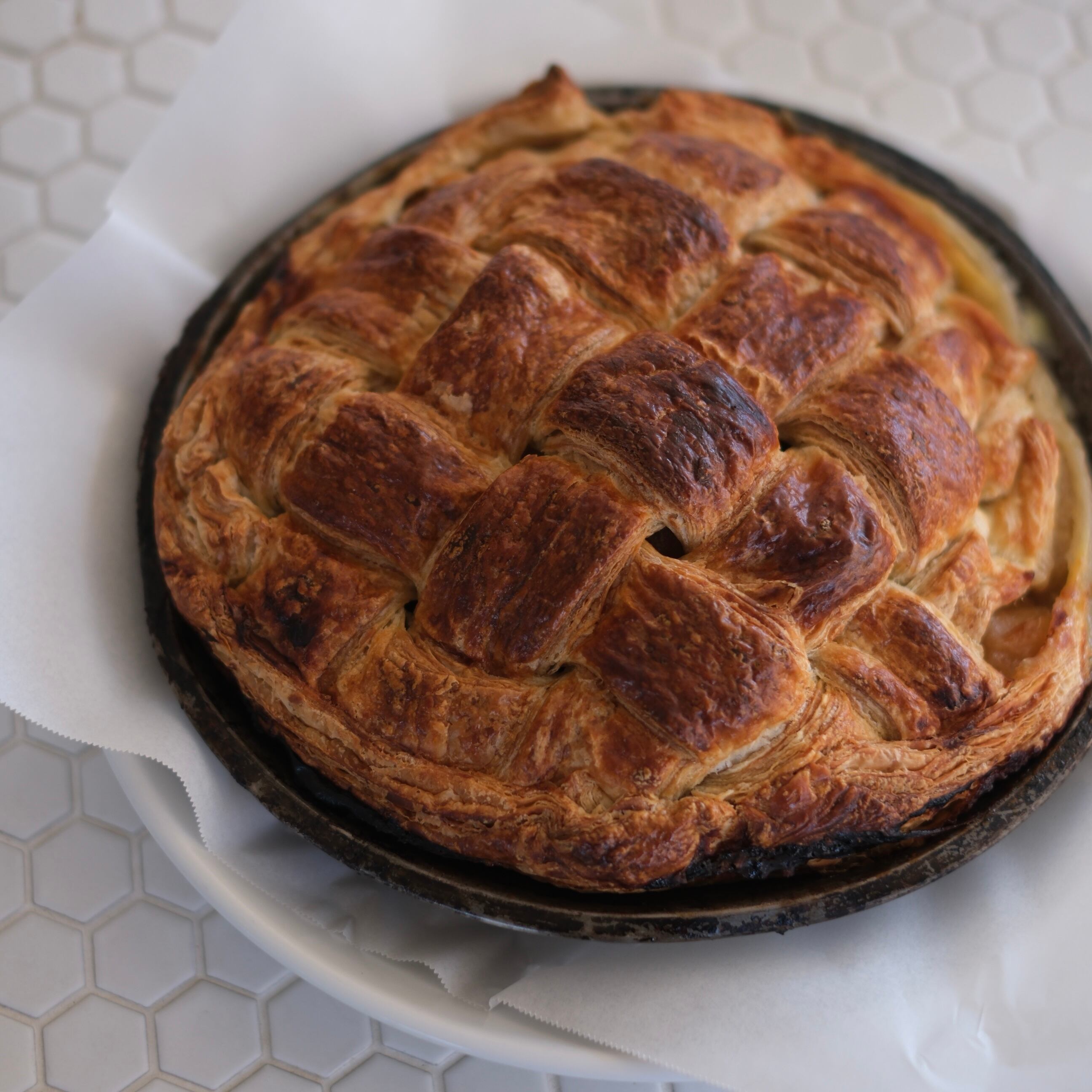 店頭でも人気のアメリカンアップルパイのホールサイズ。季節の紅玉をたっぷり使ったクラシックアップルパイです。ザクザクのパイにりんごの香りと酸味を生かしたサッと煮のコンポートがぎっしり。一口食べると、りんごの風味が広がります。